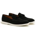 A clean black suede loafer with twin tassels, built on a lightweight white outsole for an easygoing, everyday feel